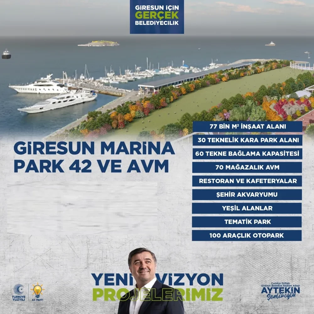 Giresun Belediye Başkan ı Av. Aytekin Şenlikoğlu, deniz şehri Giresun'a Marina projesinin çok yakışacağını dile getirerek; "Şehrimizin ortasına projelendireceğimiz bu marinamız yaklaşık 77 bin metrekare alana sahip, çok modern, birçok mağazaların bulunduğu önemli bir ticaret merkezi olacak. Dolayısıyla bölgede bulunan tüm esnaflarımızın da bu projemizden olumlu etkileneceğini ve bölgenin oldukça hareketleneceğini düşünüyoruz. Giresun Marina Park 42 ve AVM projesi adeta şehrimize lig atlatacak bir projedir. Giresun için hizmet üretmeye, Giresun'u güzelleştirmeye ve geliştirmeye kararlıyız. Bu yönde vatandaşlarımızdan ikinci bir 5 yıl için de yetki istiyoruz" şeklinde konuştu.
